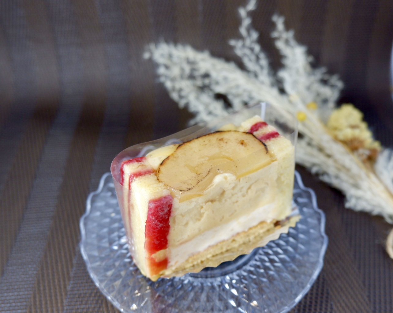 ノルマンディー産のりんごのブランデーを使ったムースにラズベリーを挟んだ生地、上にバターで焼いた林檎が乗っています